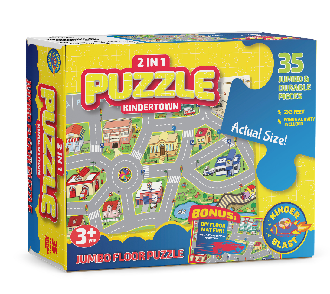 2-in-1 Puzzle for double the fun, bigger than ever! Putting together this oversized, durable and washable Kindertown floor puzzle is a great activity for kids and friends... but revealing the finished picture doesn’t mean the fun is over! Flip over the completed puzzle to find the Kindertown scene on the back--ready to be driven on, walked on, and explored for a second round of playtime.